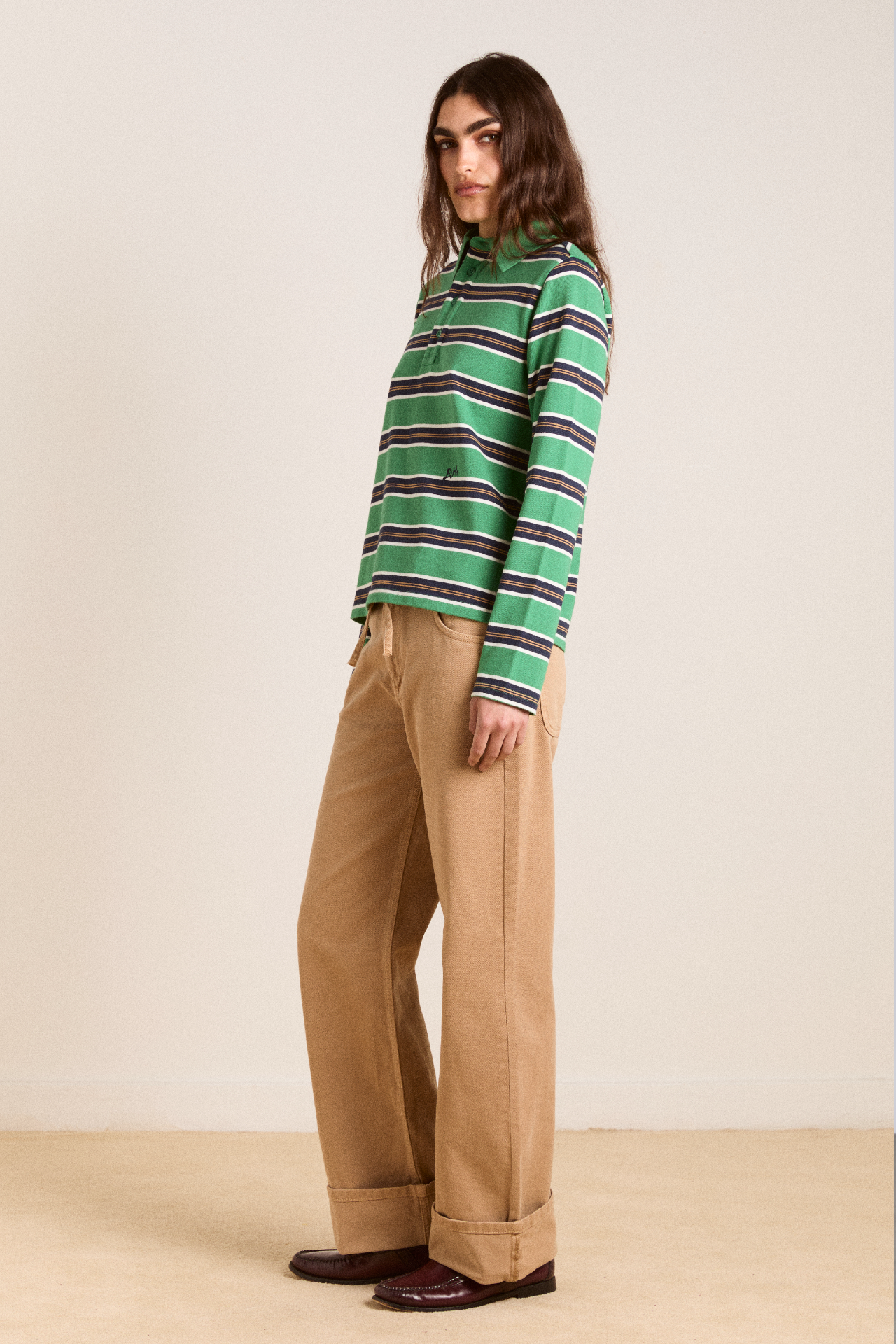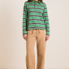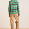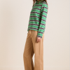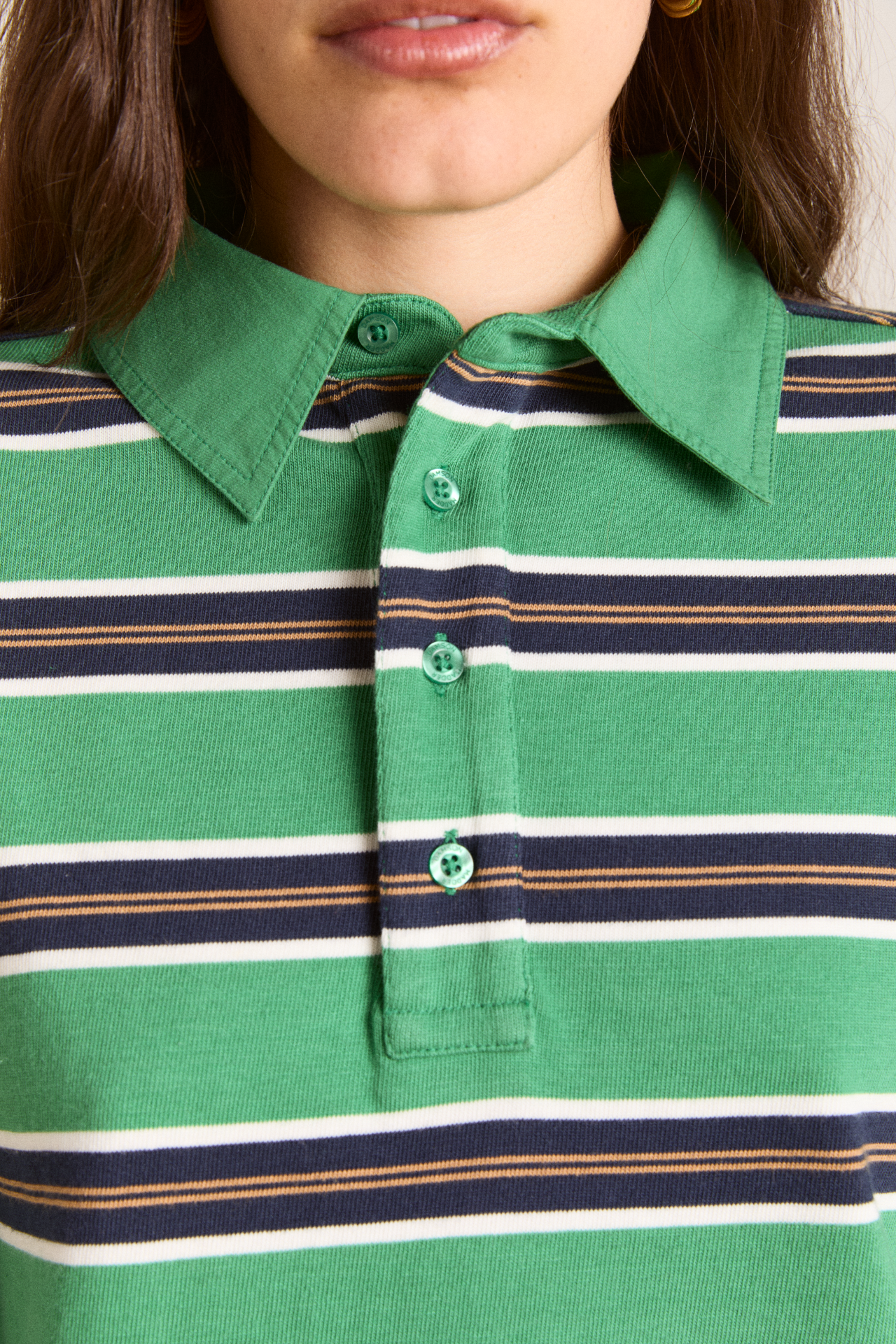 Our best-selling rugby has been reimagined in a new shrunken fit. The Cassia Shrunken Rugby in green stripe fuses traditional sporty style with a modern silhouette. Made from 100% organic cotton, it features a button placket and woven collar. Finished with our signature DM embroidery detailing on the front.