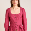 Meet the effortlessly wearable Clare Blouse. Crafted from 100% organic cotton in a striking berry business stripe, this blouse features a button up front with a flattering square neckline, and a removable belt to bring structure to the silhouette.