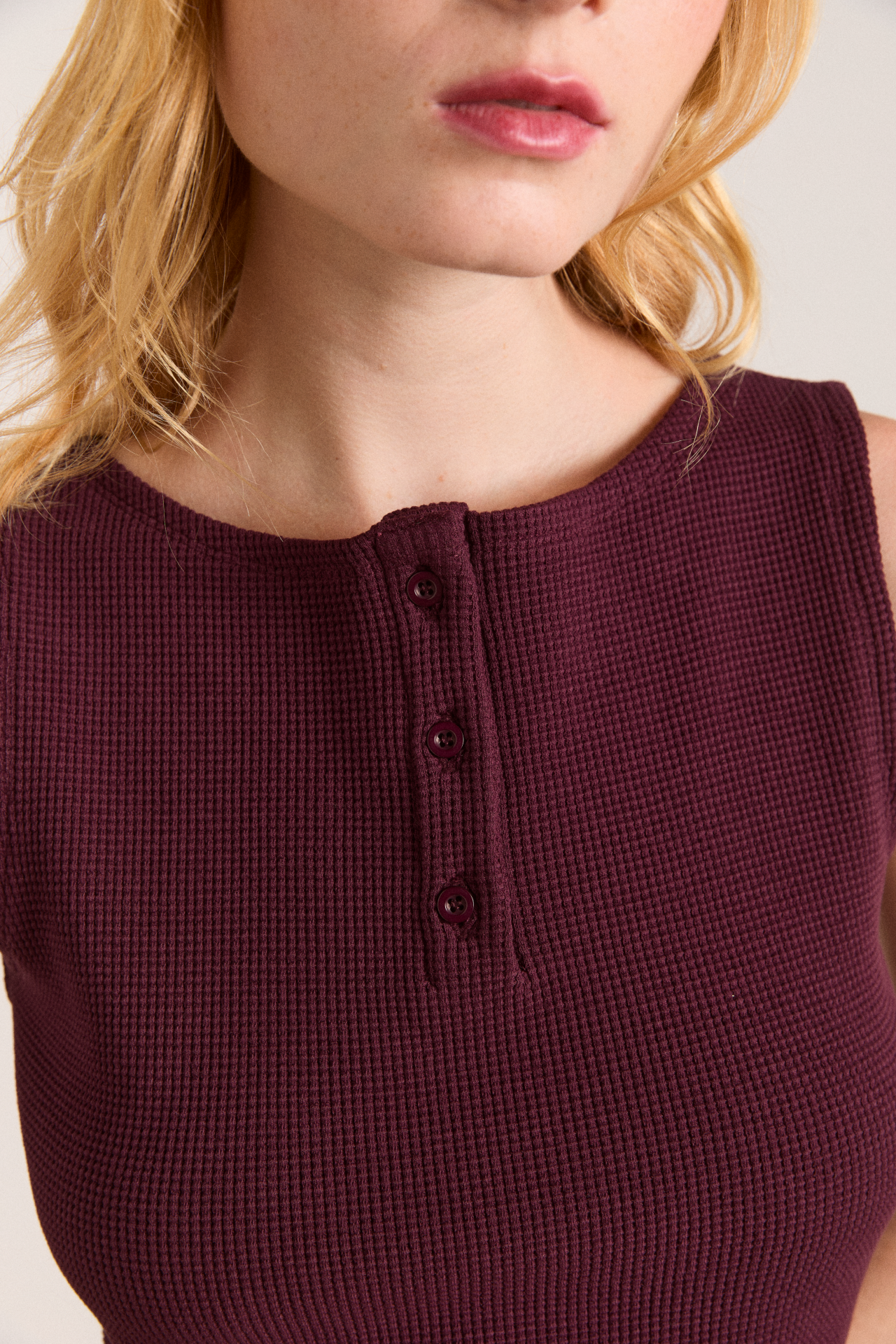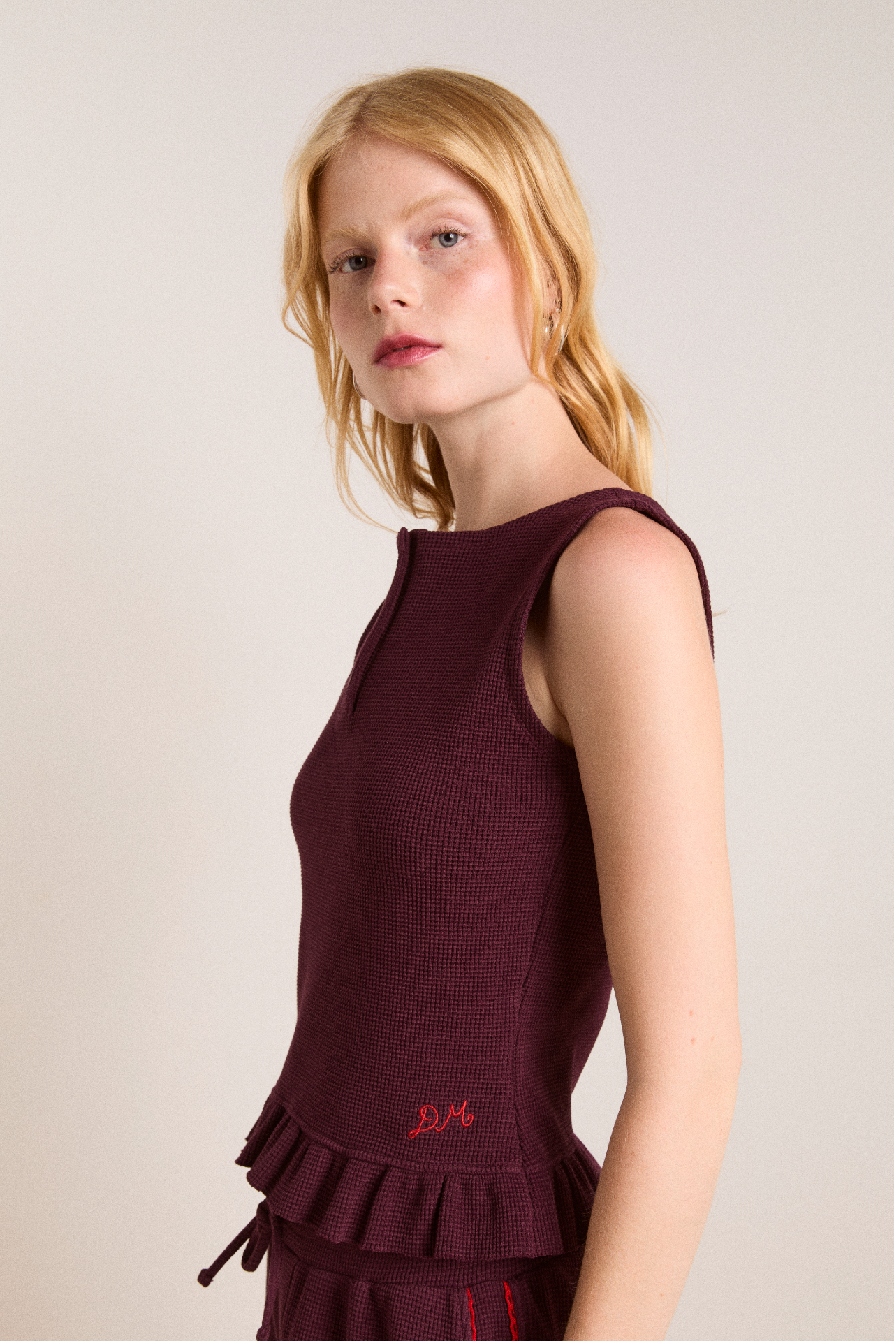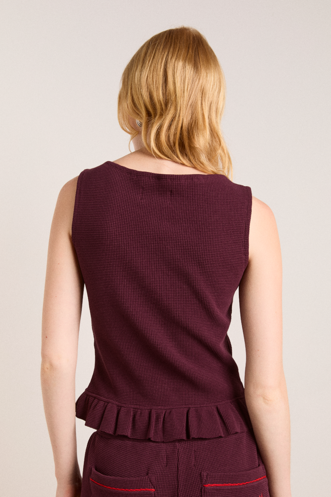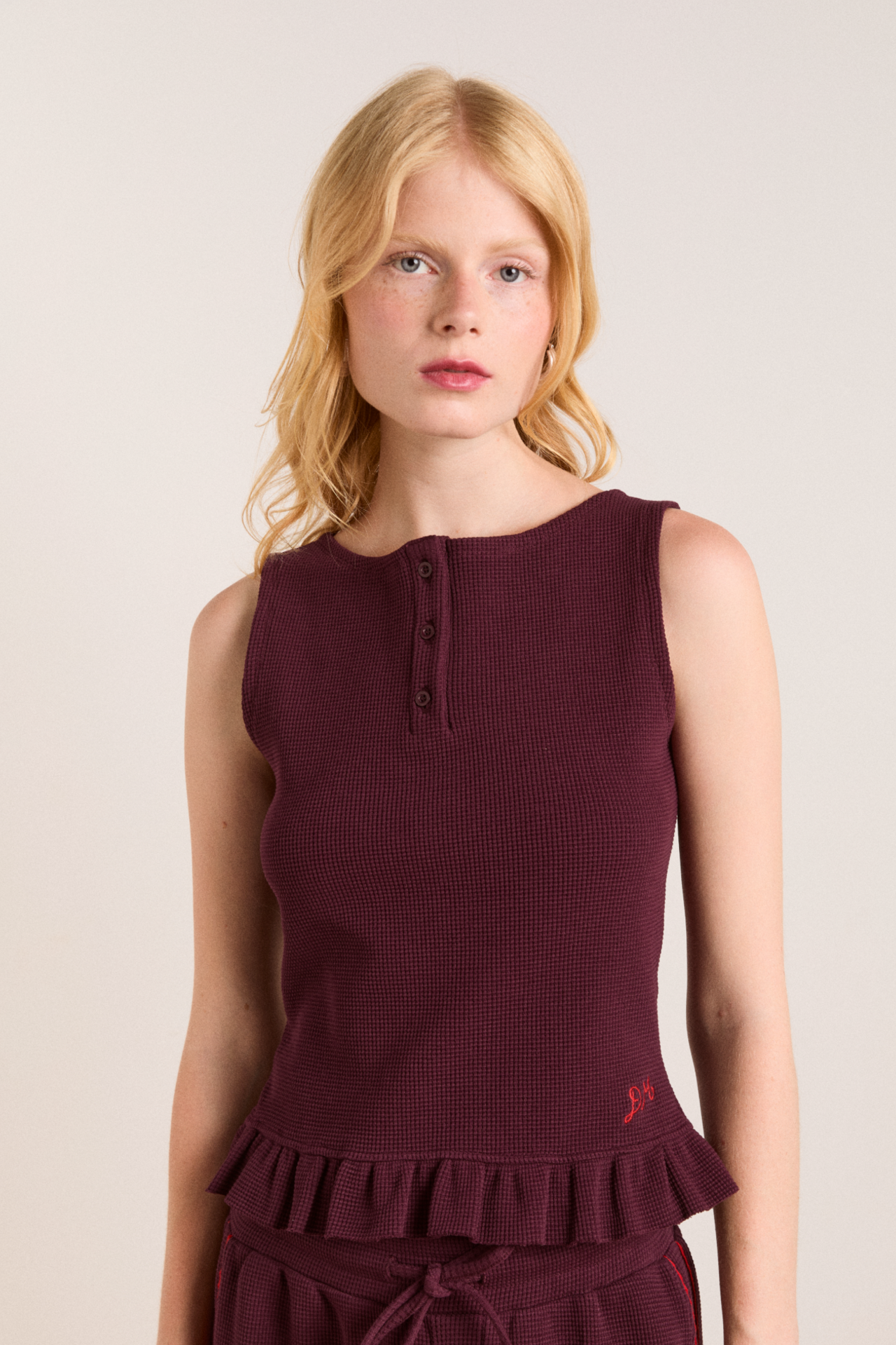 A fresh take on everyday comfort, the Hattie Waffle Cami in burg features a soft boat neck, mini button placket, and a flattering sleeveless fit. Finished with a playful ruffle hem, this organic cotton blend piece pairs perfectly with the matching Piper Waffle Jogger.
