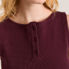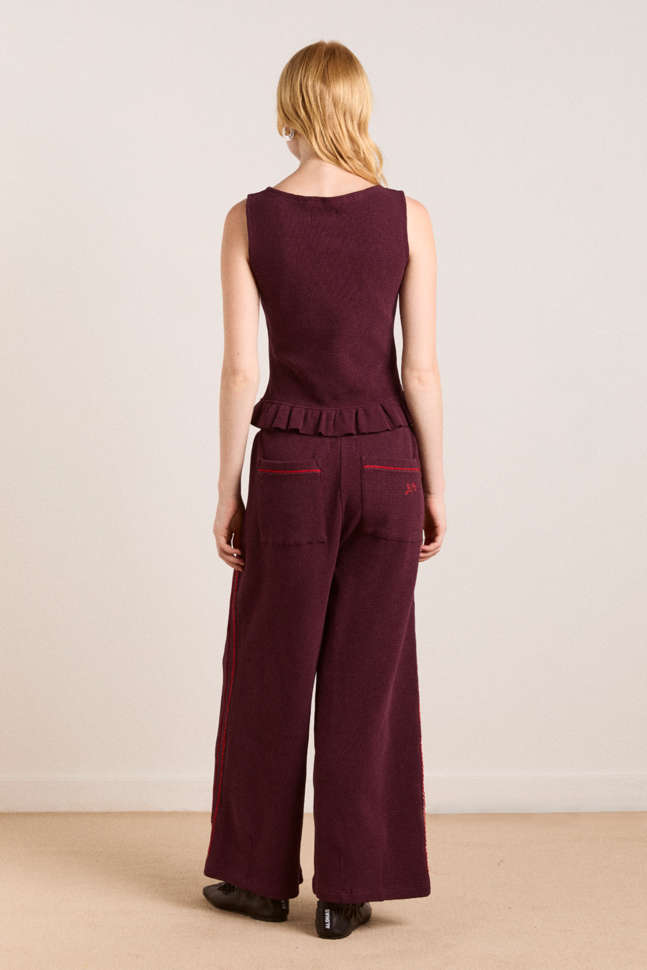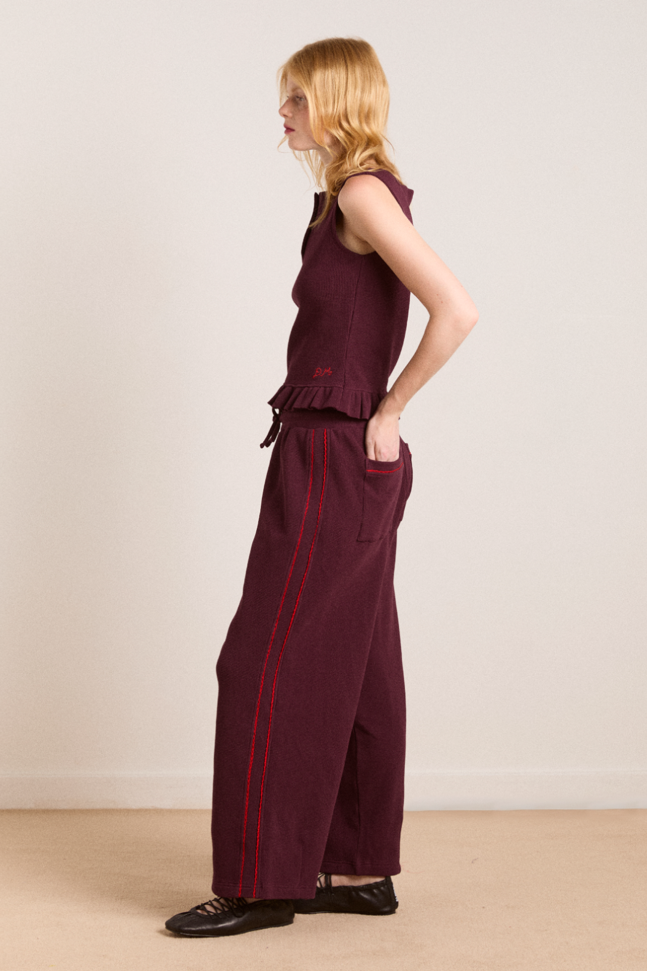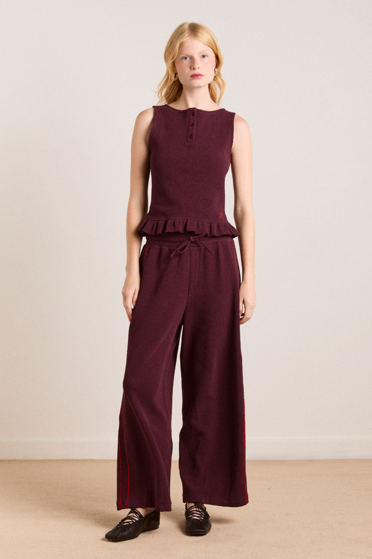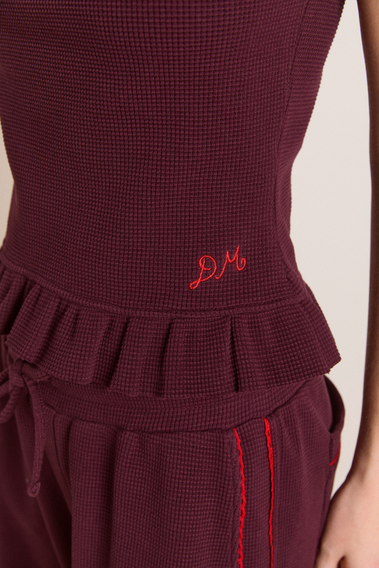 A fresh take on everyday comfort, the Hattie Waffle Cami in burg features a soft boat neck, mini button placket, and a flattering sleeveless fit. Finished with a playful ruffle hem, this organic cotton blend piece pairs perfectly with the matching Piper Waffle Jogger.