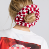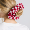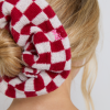 Go big with our oversized knitted scrunchie in red and ecru checkerboard.