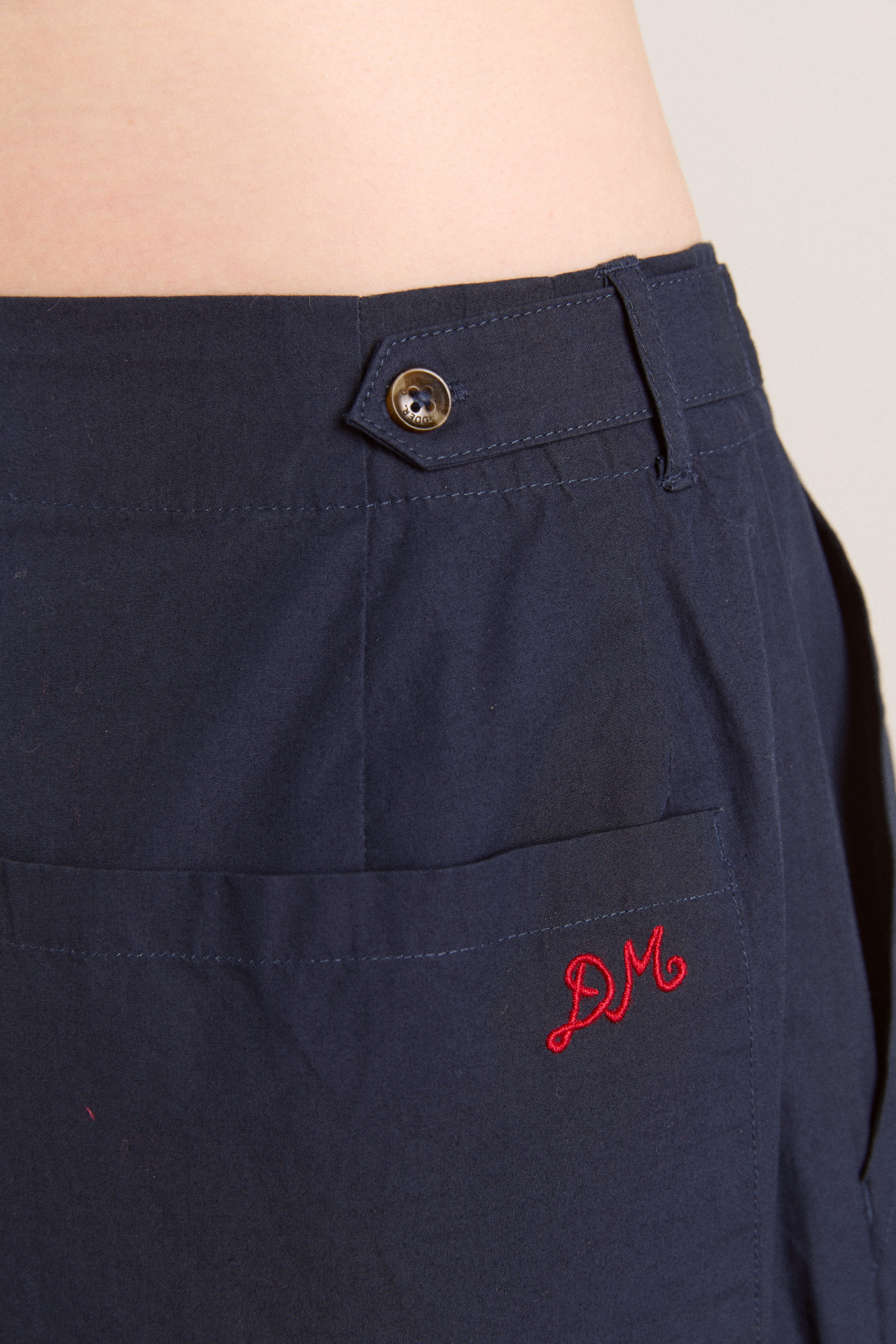 • DM embroidery detail on back pocket
