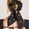 Meet our new Tie Detail Scrunchie in navy and olive spot. The perfect addition to any outfit, this scrunchie features an all over spot print and our signature DM embroidered logo in red. Pair with our matching Vela Tote Bag and Malinda Dress.
