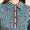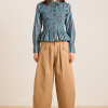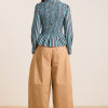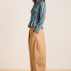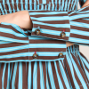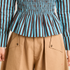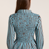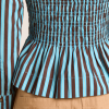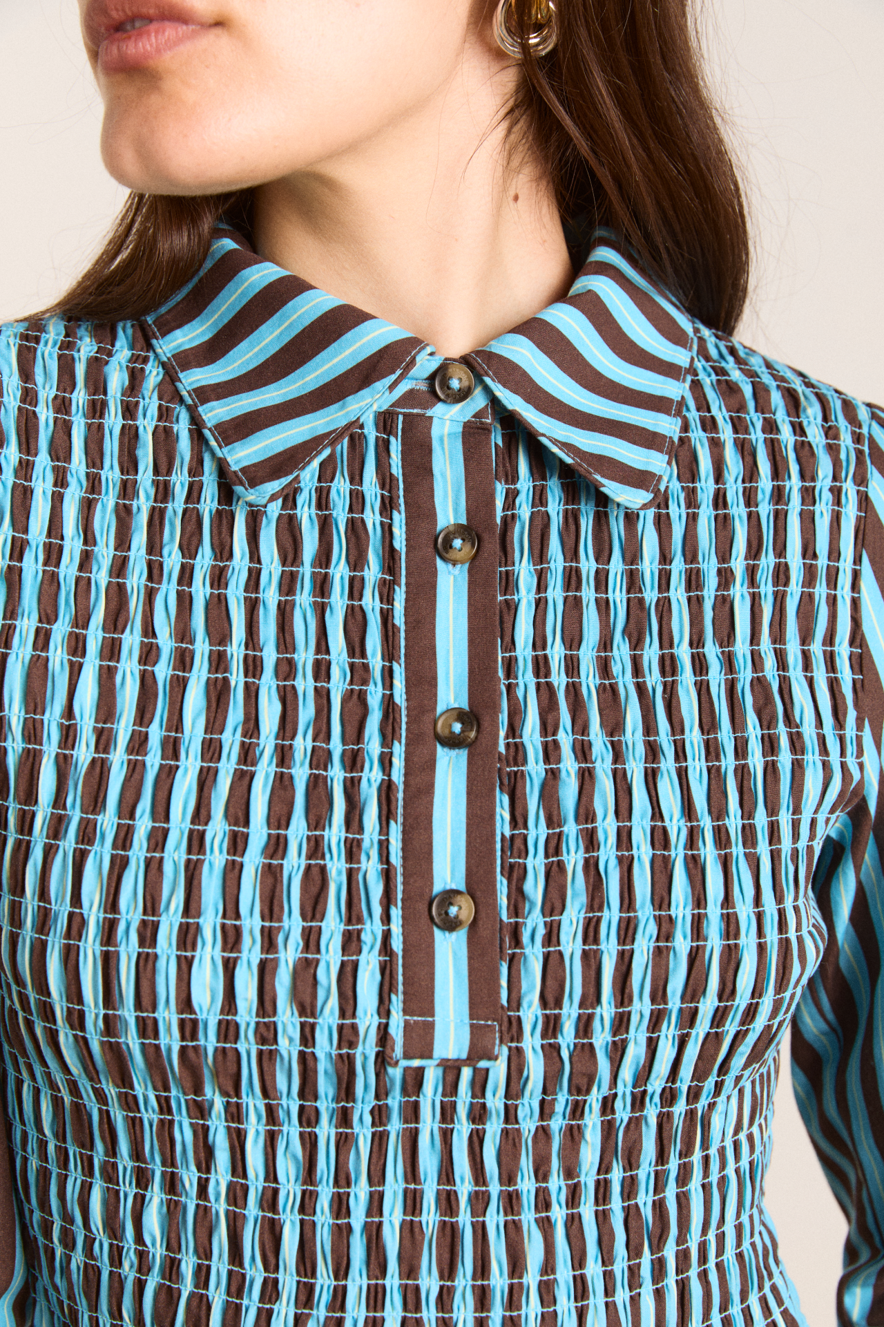 Our Hazel Shirt in blue choc stripe is the perfect mix of tailored and feminine. With shirred detailing, button down placket and a peplum hem, this 100% organic cotton top is a stand out piece. Pair with our matching accessories.