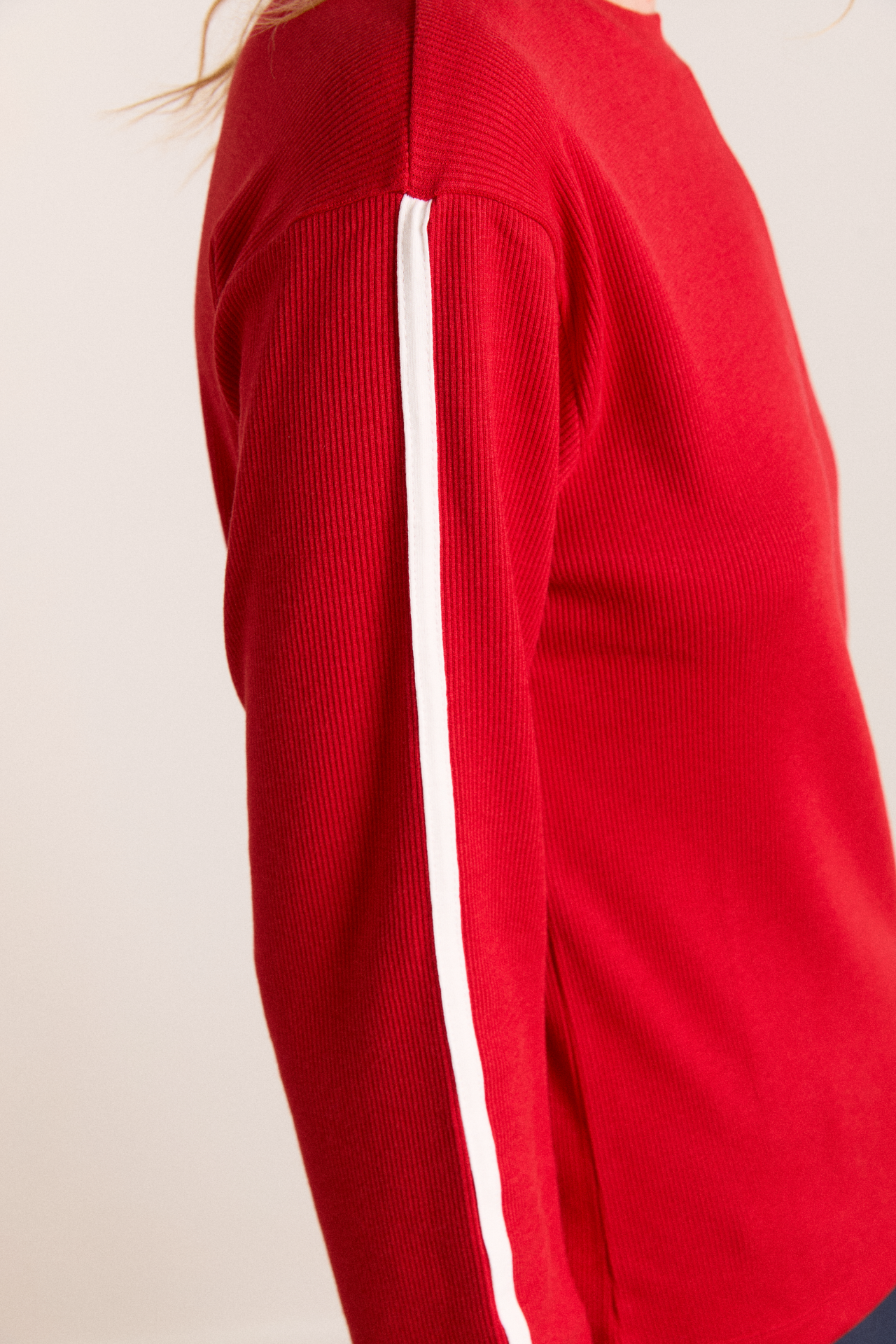 Bringing signature Damson details to everyday essentials, meet the Lilah Long Sleeve Top in red rib. This relaxed fit crew neck features a contrast side stripe down the arms and DM embroidery, fusing comfort and style to create the ultimate cool-girl top.